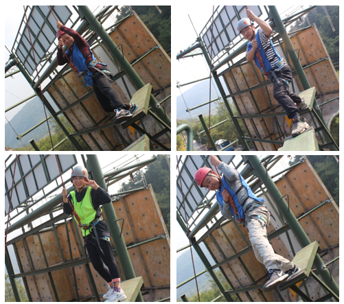 高空断桥项目中,各队队员为了本队荣誉,依次通过了离地8米高的断桥,挑战了自我,突破了自身极限。
